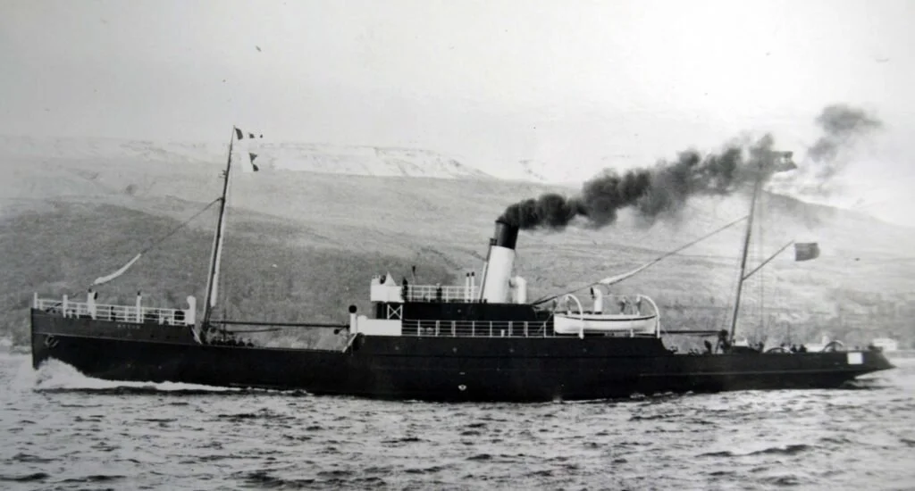 HMS Sarnia, another ferry steamer, was bigger than Hythe and had a top speed of 20 knots. Having already landed her cargo and troops she had left port whilst the Hythe was just about to enter, steering on course S67°W as Hythe headed N82°E – near head-on.